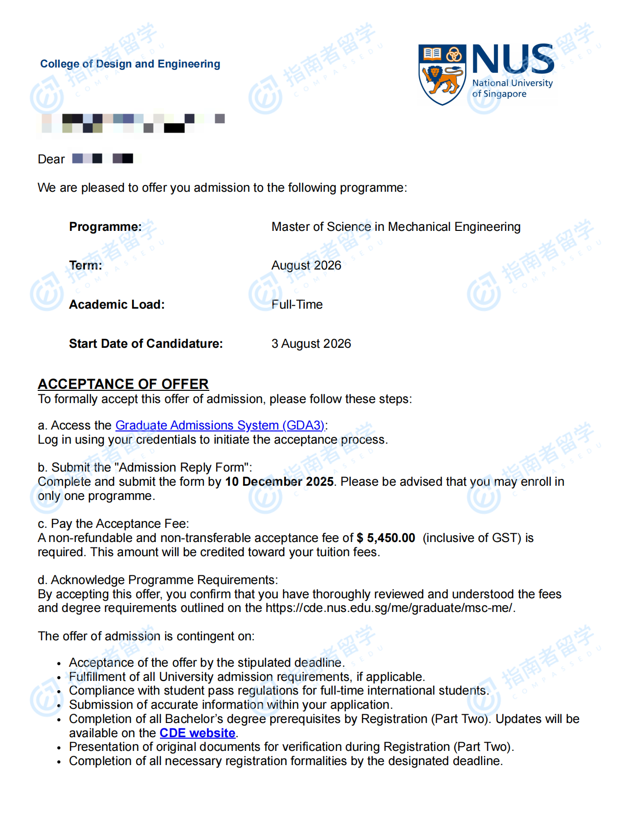 新加坡国立大学机械工程理学硕士研究生offer一枚