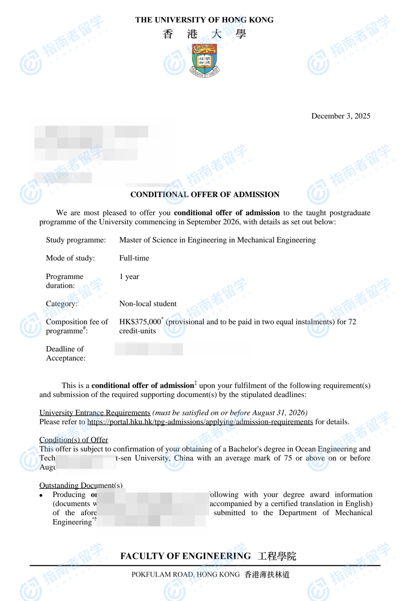 香港大学机械工程(工程)理学硕士研究生offer一枚