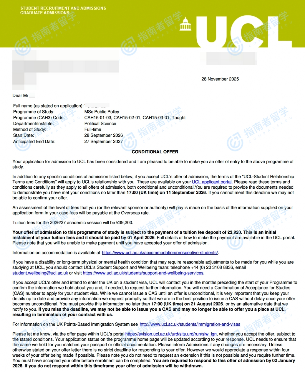 伦敦大学学院公共政策理学硕士研究生offer一枚