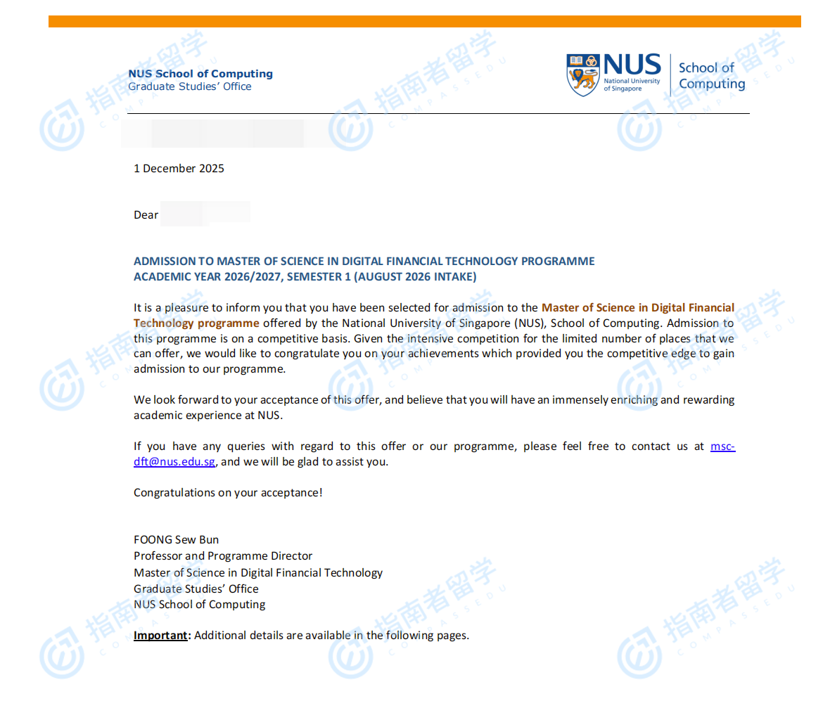 新加坡国立大学数码金融科技理学硕士研究生offer一枚