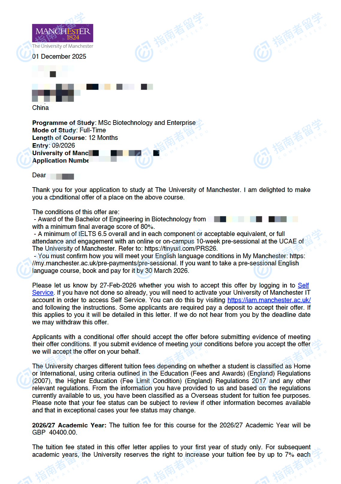 曼彻斯特大学生物技术与企业理学硕士研究生offer一枚