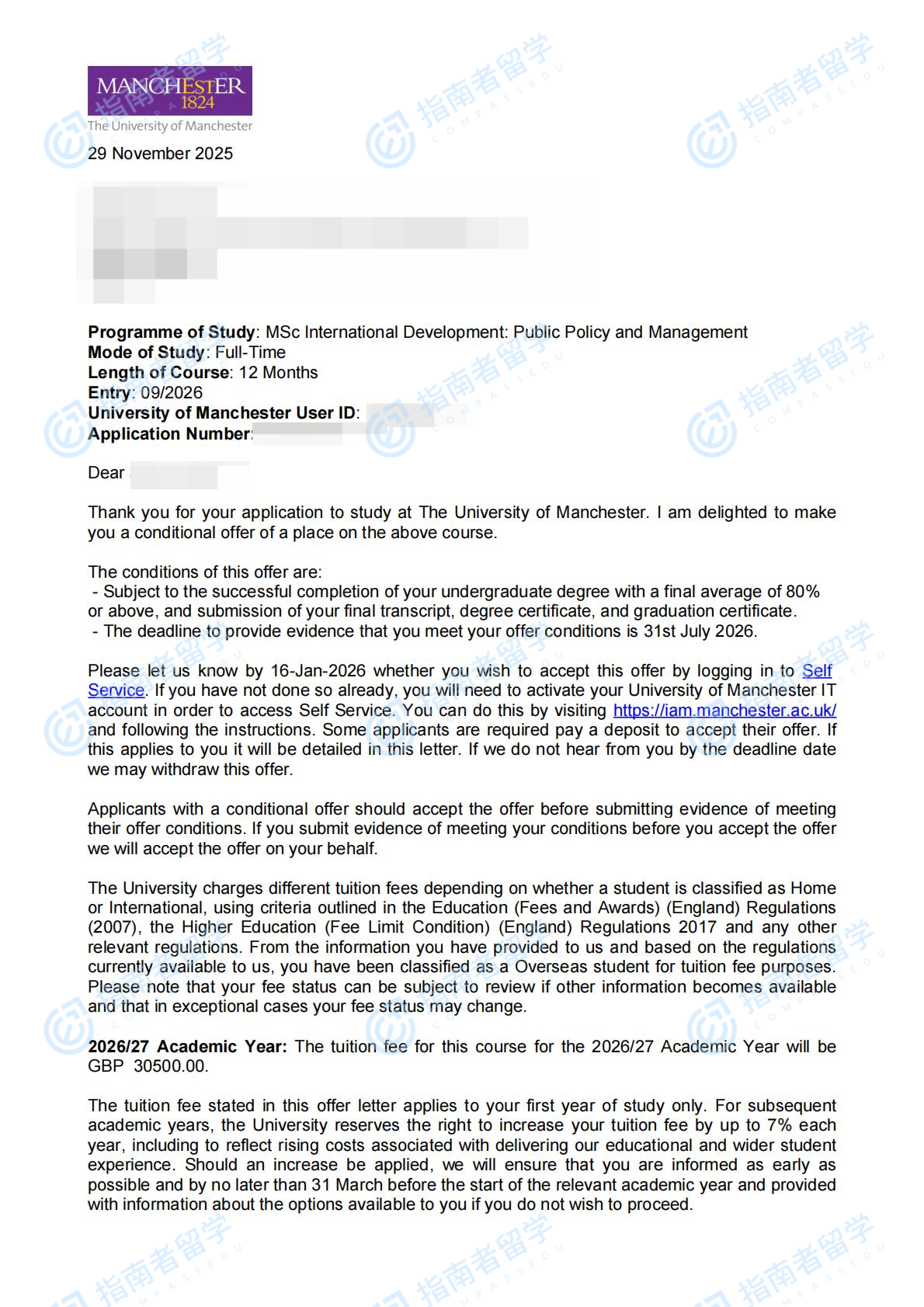 曼彻斯特大学国际发展:公共政策与管理理学硕士研究生offer一枚