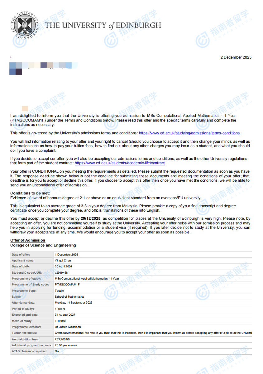 爱丁堡大学计算应用数学理学硕士研究生offer一枚