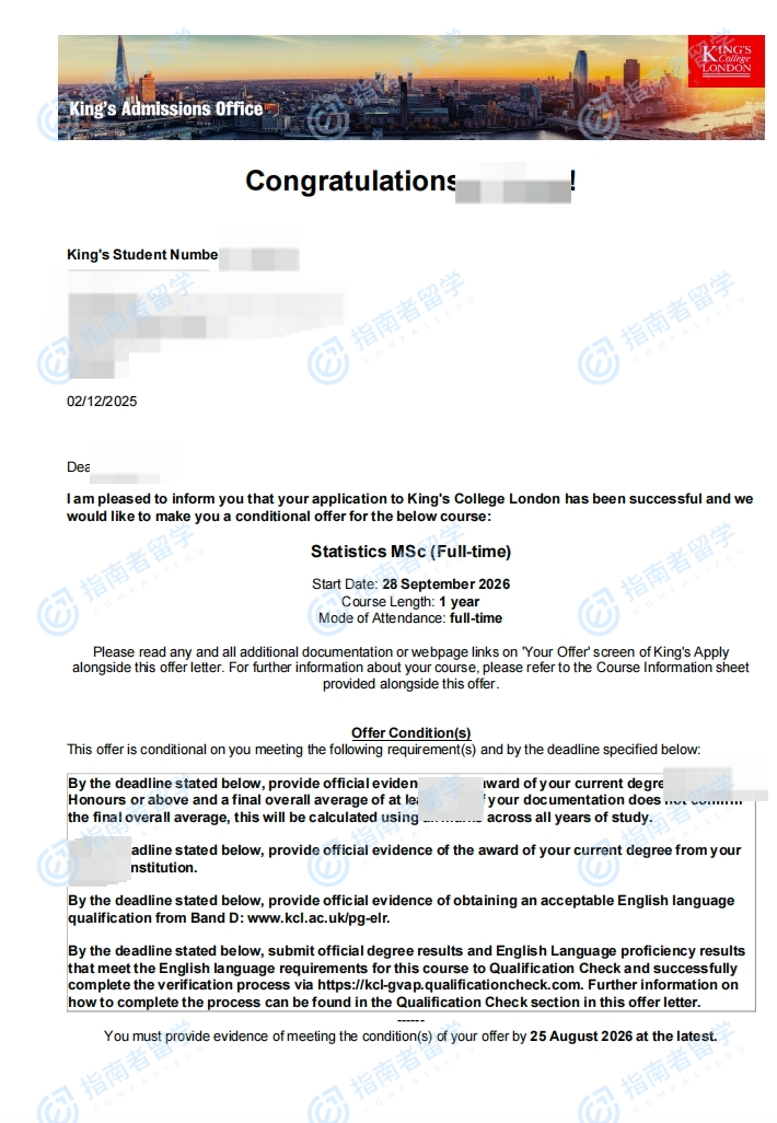 伦敦大学国王学院统计学理学硕士研究生offer一枚