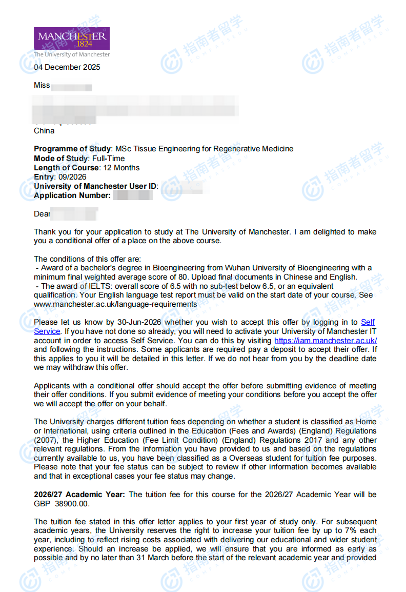 曼彻斯特大学再生医学组织工程理学硕士研究生offer一枚