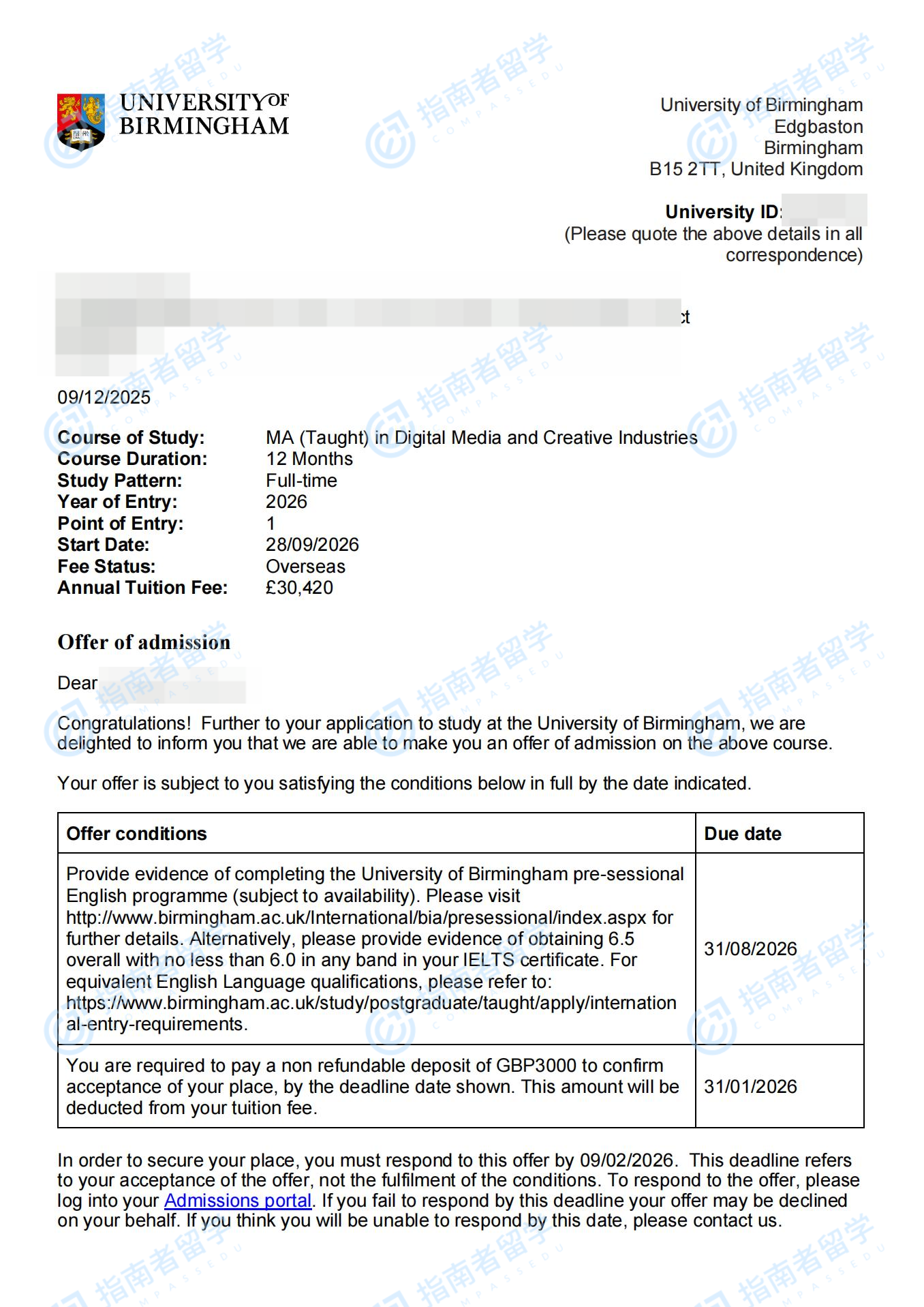 伯明翰大学数字传媒与创意产业文学硕士研究生offer一枚