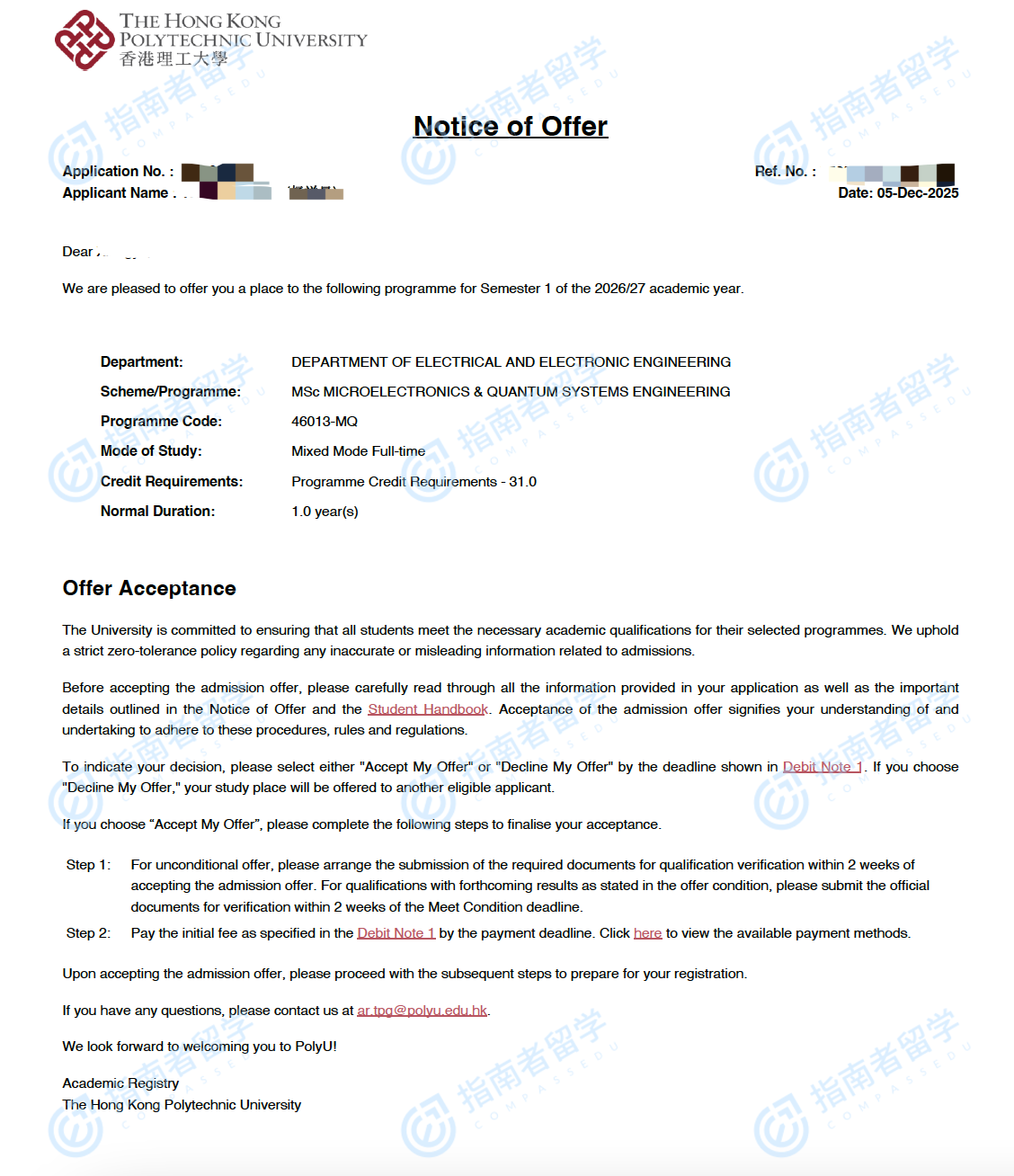 香港理工大学微电子与量子系统工程理学硕士研究生offer一枚