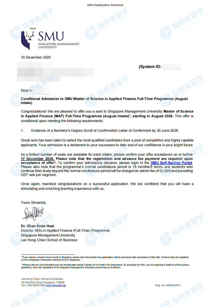 新加坡管理大学应用金融学理学硕士研究生offer一枚