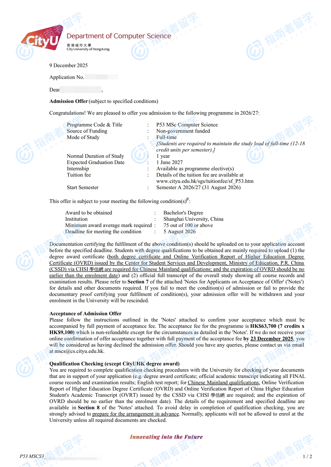 香港城市大学计算机科学理学硕士研究生offer一枚