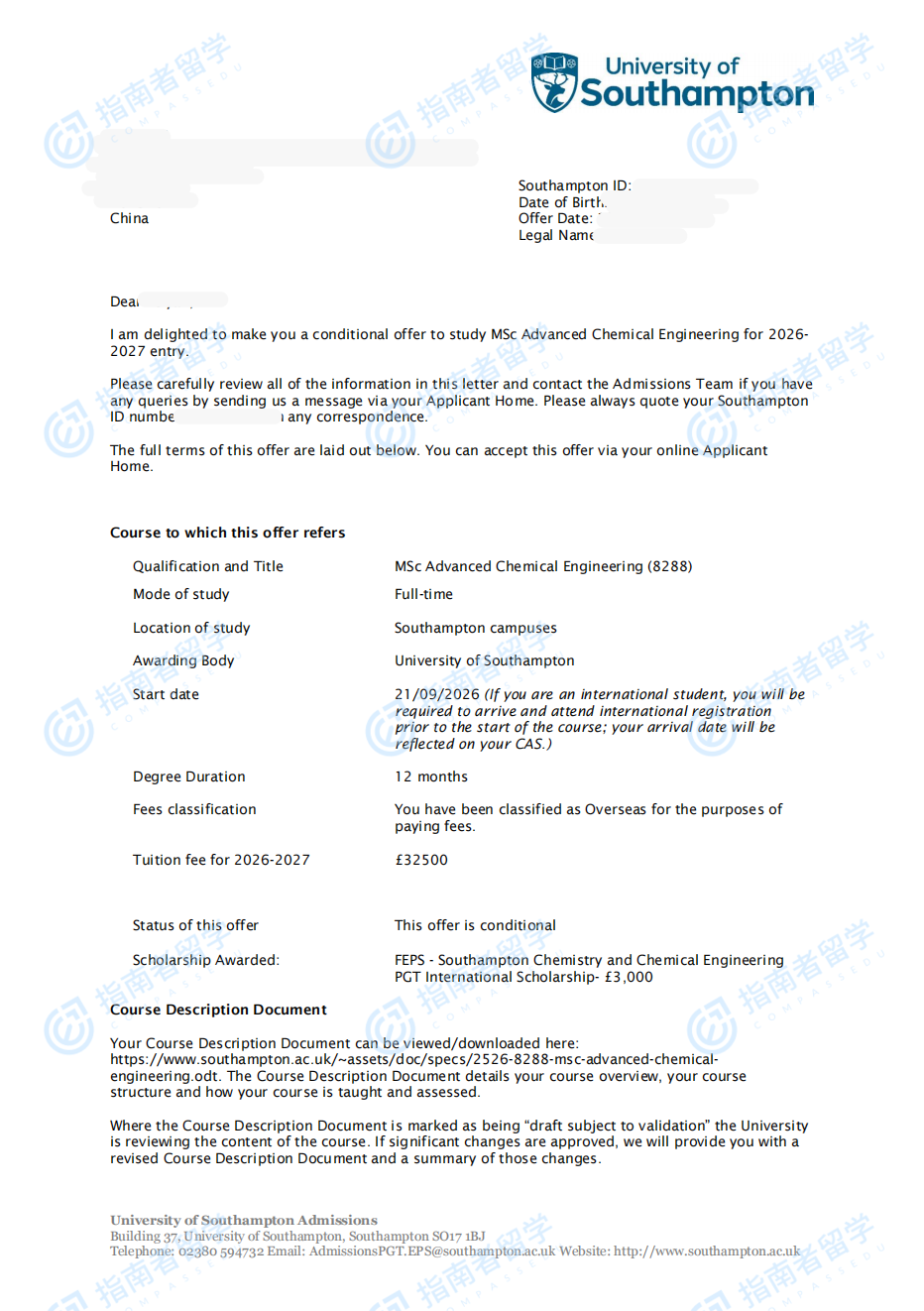 南安普顿大学高级化学工程理学硕士研究生offer一枚