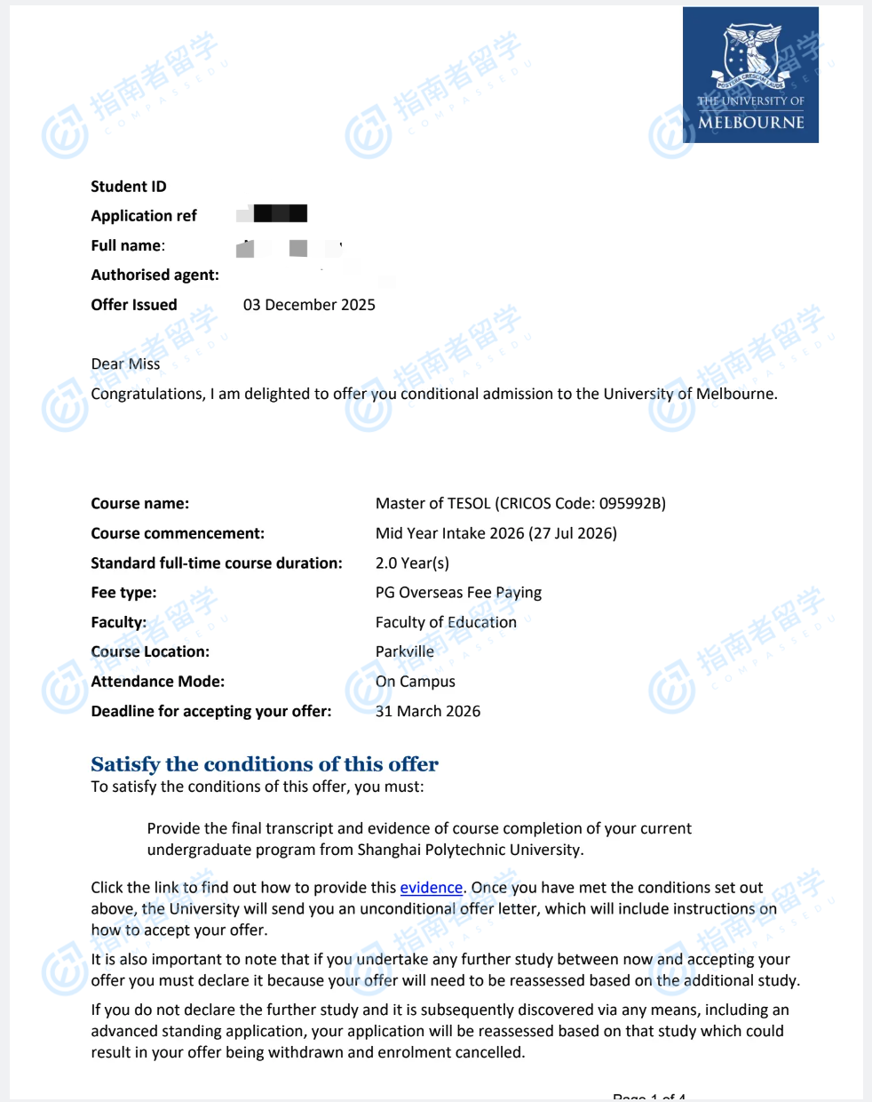 墨尔本大学对外英语教学硕士研究生offer一枚