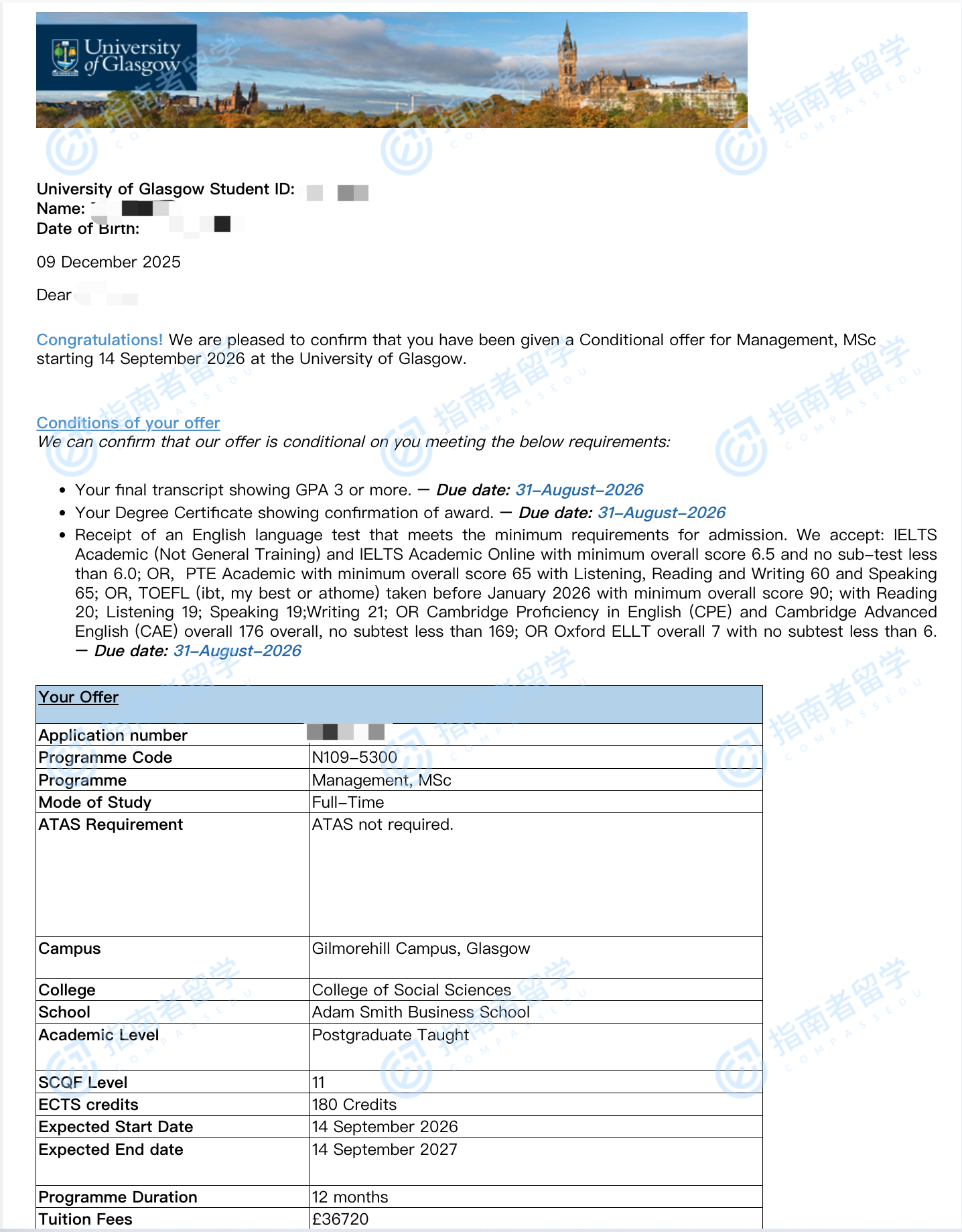 格拉斯哥大学管理学理学硕士研究生offer一枚