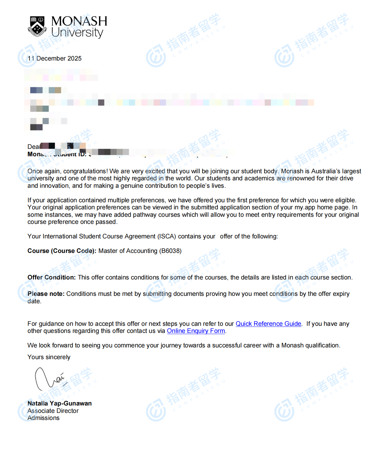 莫纳什大学会计学硕士(1.5年制)研究生offer一枚