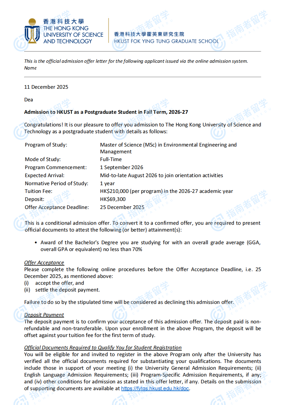 香港科技大学环境健康与安全理学硕士研究生offer一枚