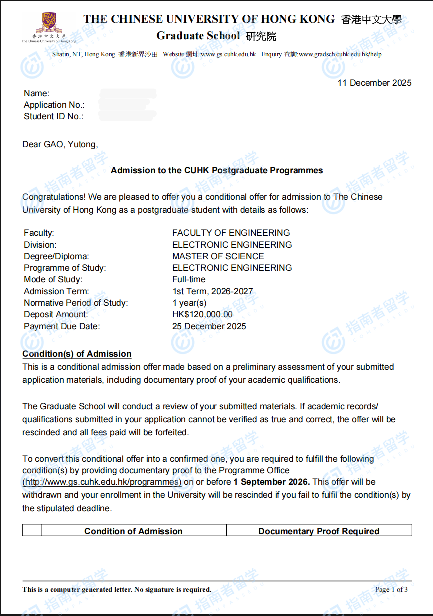 香港中文大学电子工程理学硕士研究生offer一枚