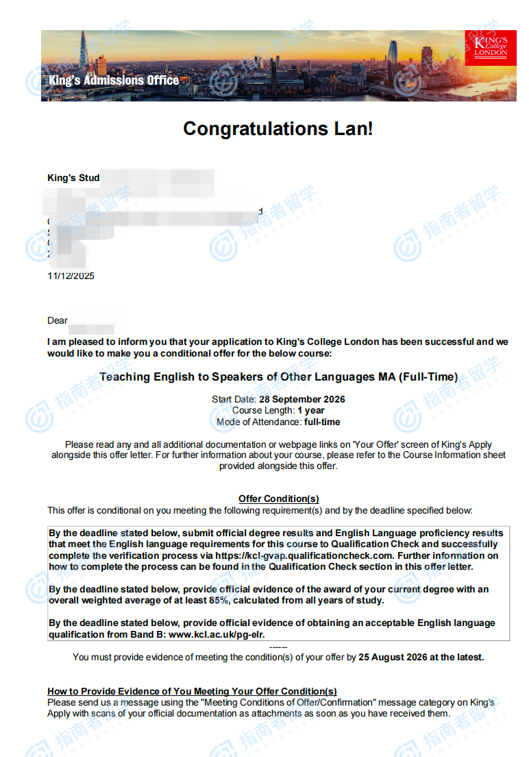 伦敦大学国王学院对外英语教学文学硕士研究生offer一枚