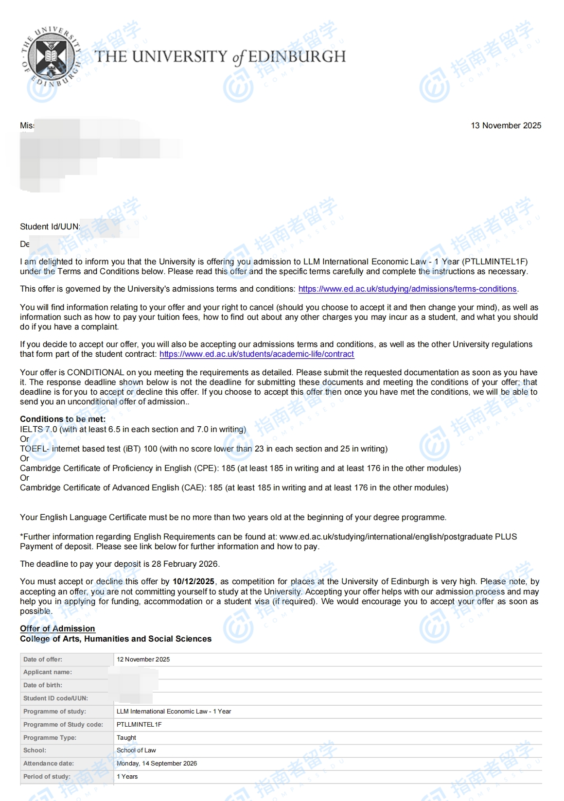 爱丁堡大学国际经济法法学硕士研究生offer一枚