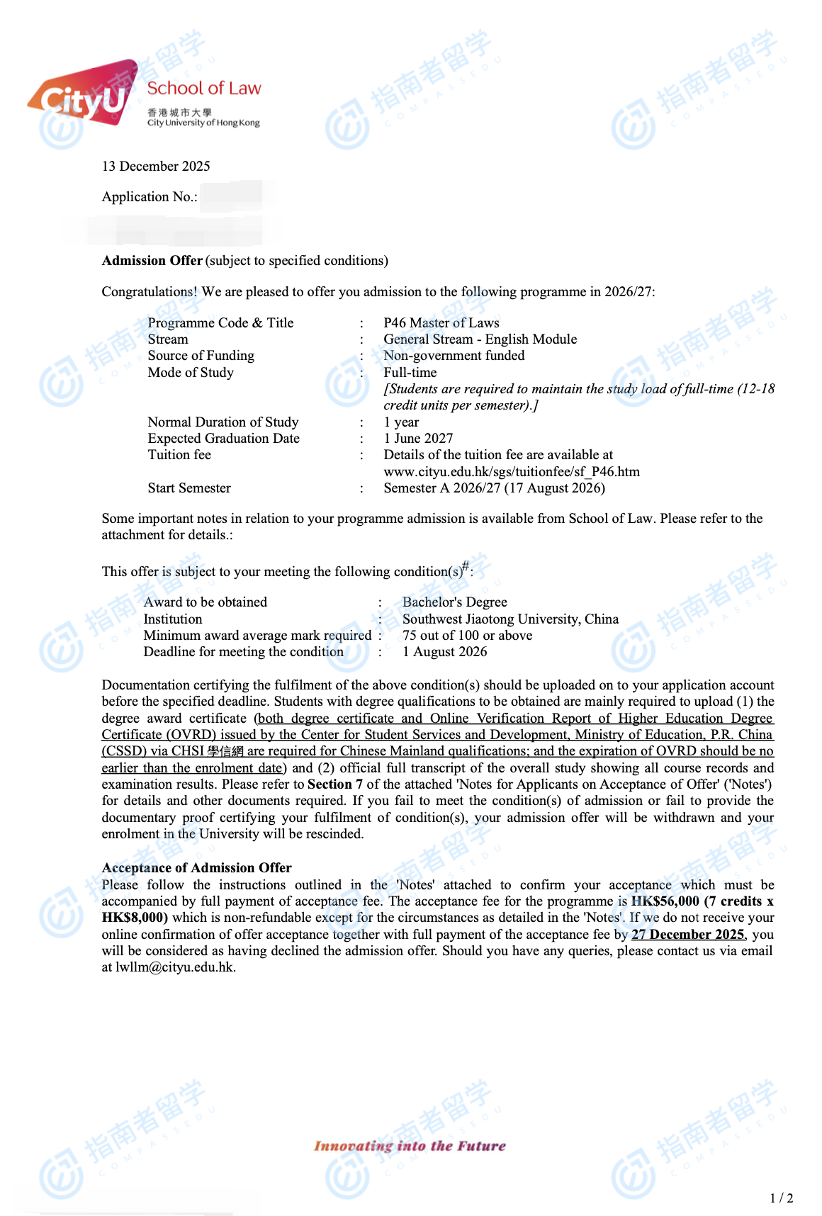 香港城市大学法学硕士研究生offer一枚