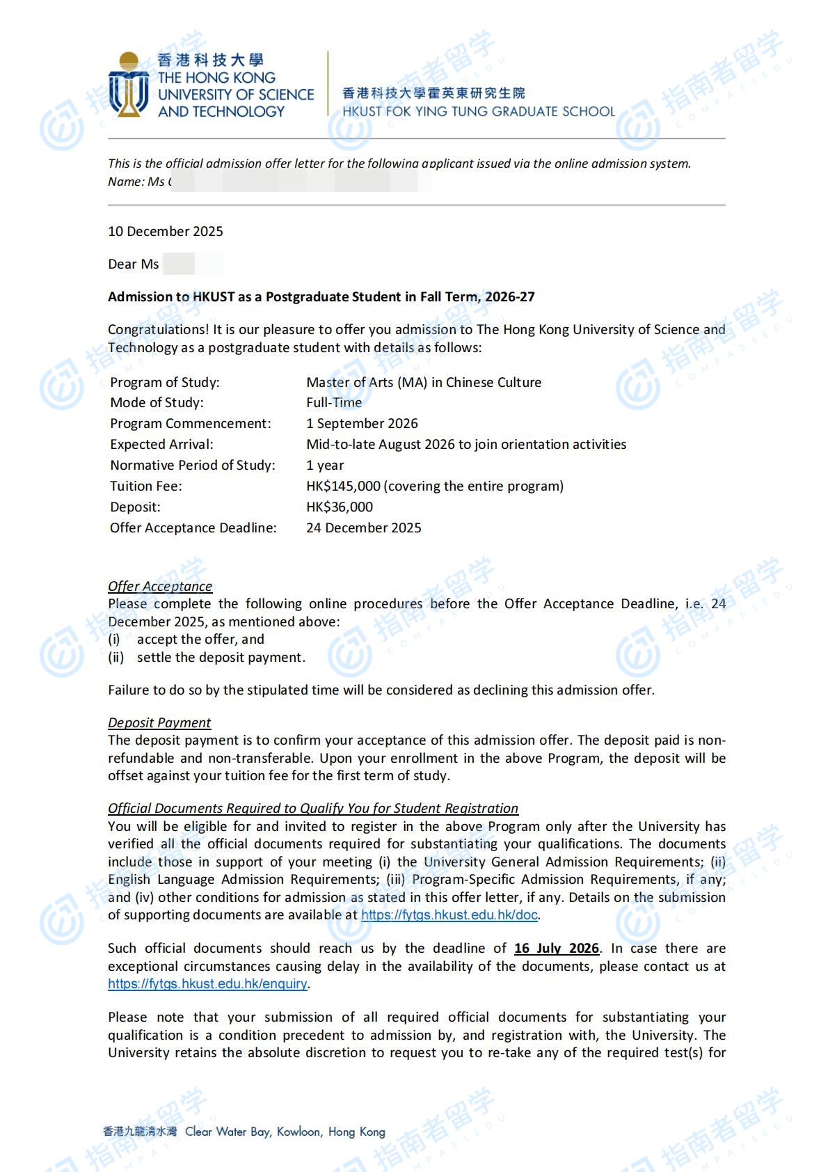 香港科技大学中国文化文学硕士研究生offer一枚