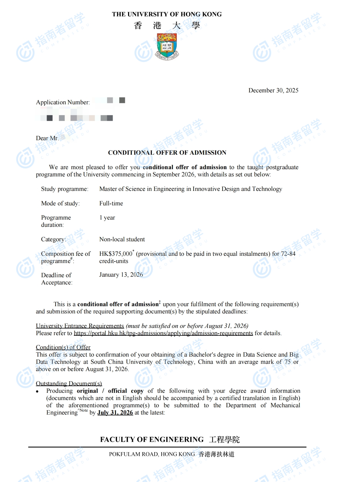 香港大学创新设计与科技(工程)理学硕士研究生offer一枚