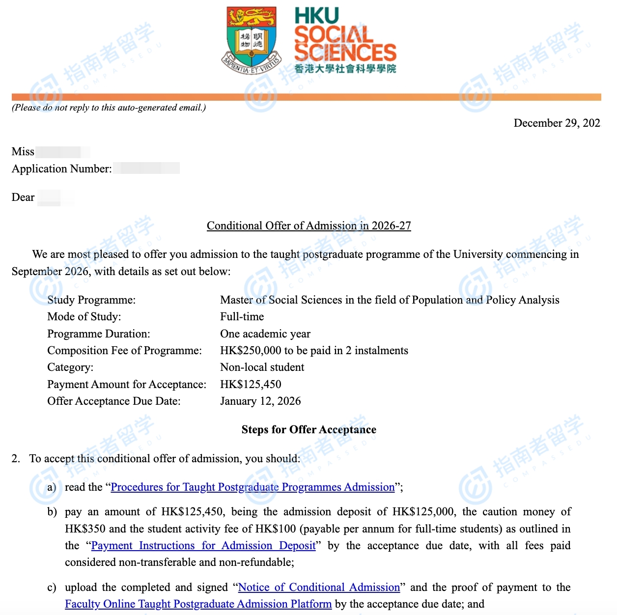 香港大学人口与政策分析社会科学硕士研究生offer一枚