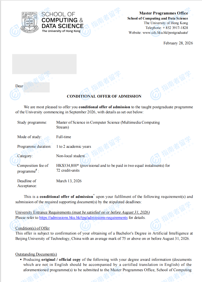 香港大学计算机科学理学硕士(多媒体计算方向)研究生offer一枚