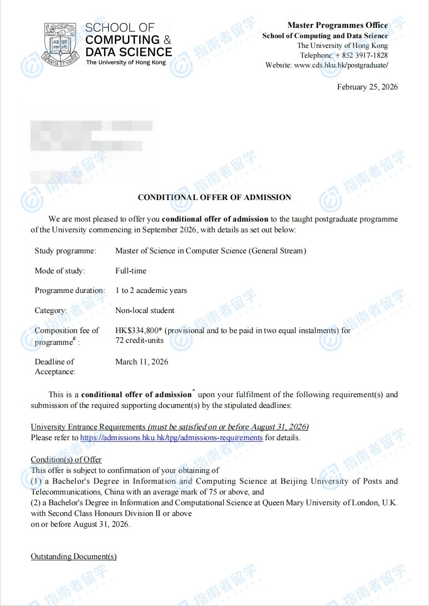 香港大学计算机科学理学硕士(常规方向)研究生offer一枚