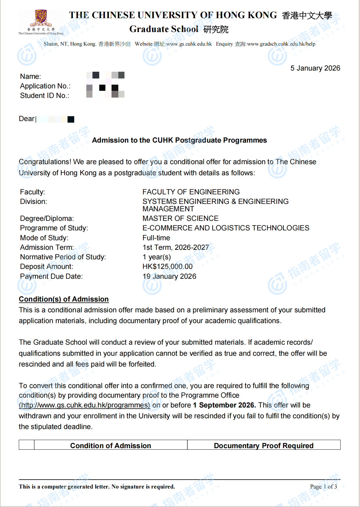 香港中文大学电子商务与物流技术理学硕士研究生offer一枚