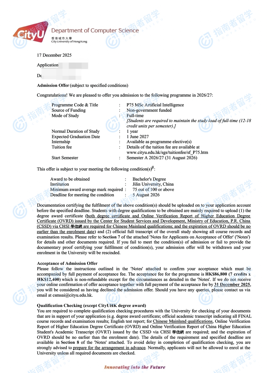 香港城市大学人工智能理学硕士研究生offer一枚