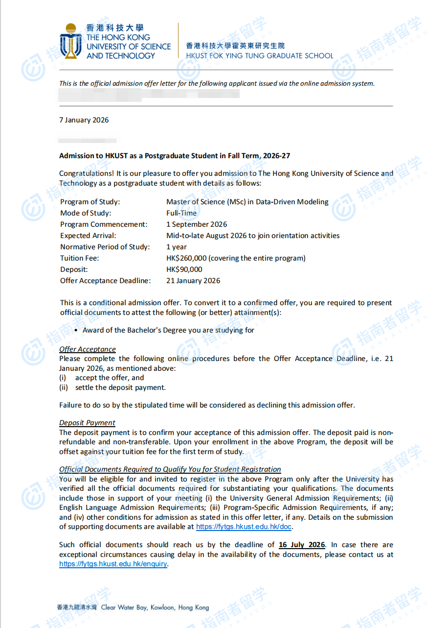 香港科技大学数据驱动建模理学硕士研究生offer一枚