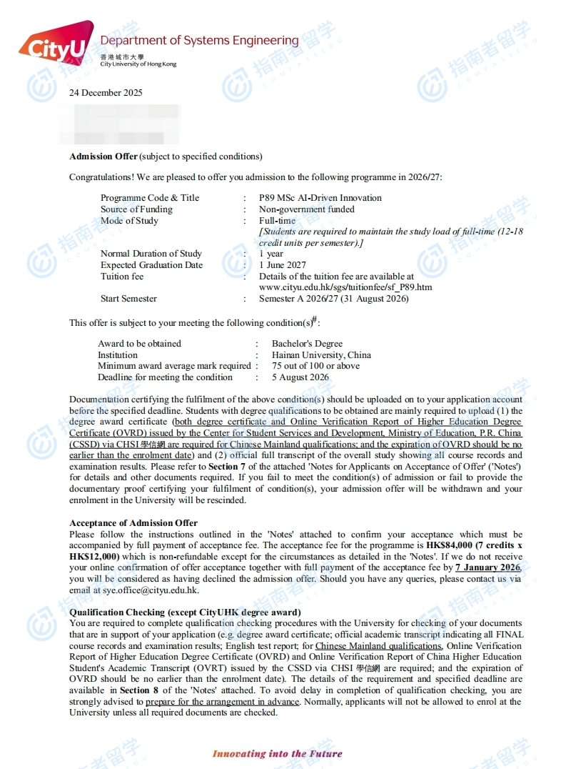 香港城市大学人工智能驱动创新理学硕士研究生offer一枚