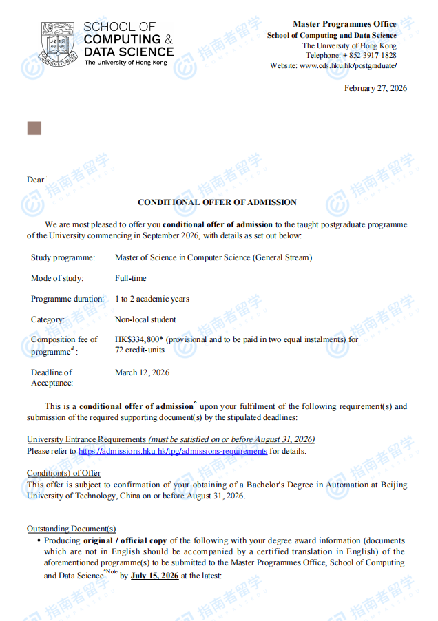 香港大学计算机科学理学硕士(常规方向)研究生offer一枚