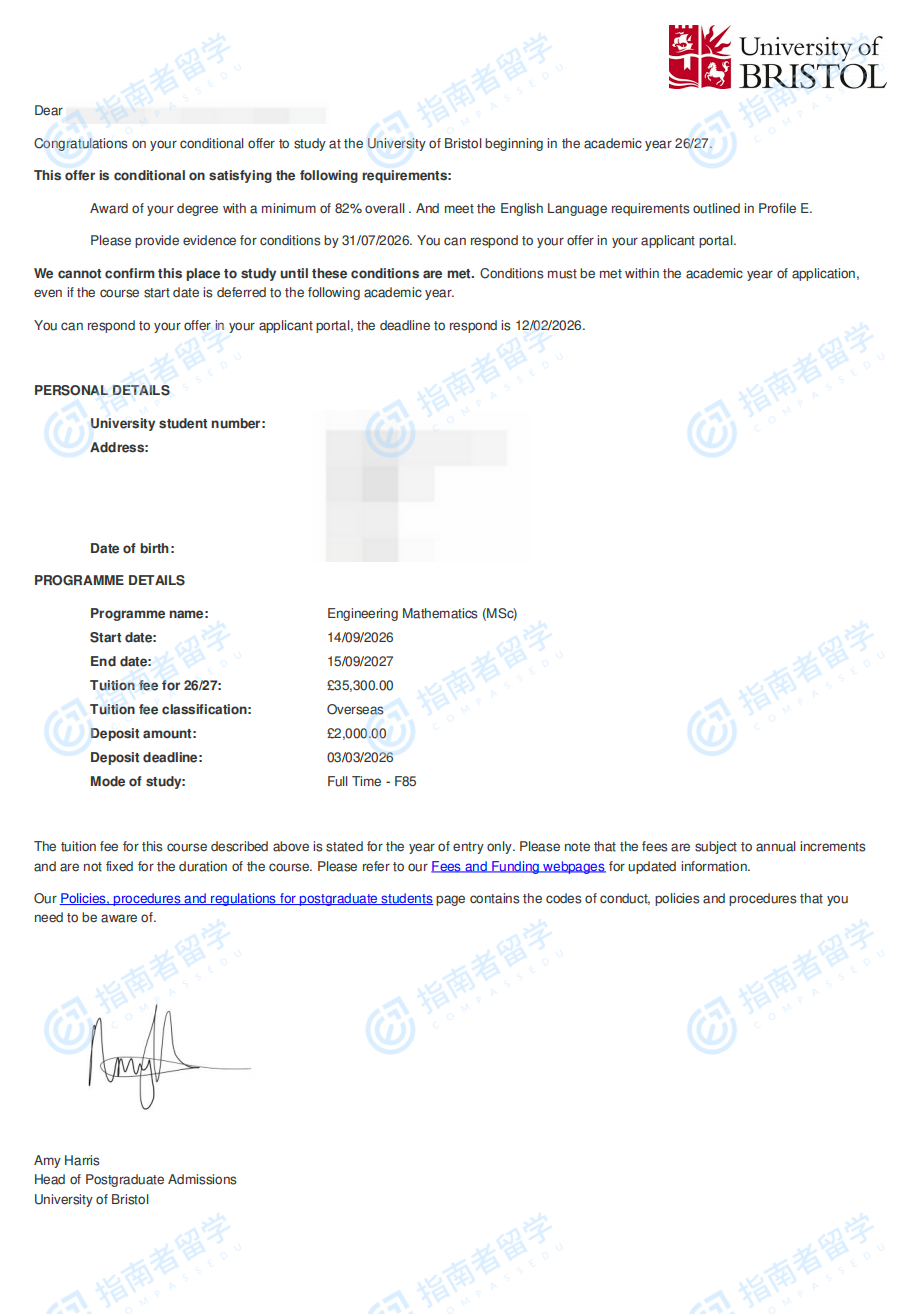 布里斯托大学工程数学理学硕士研究生offer一枚