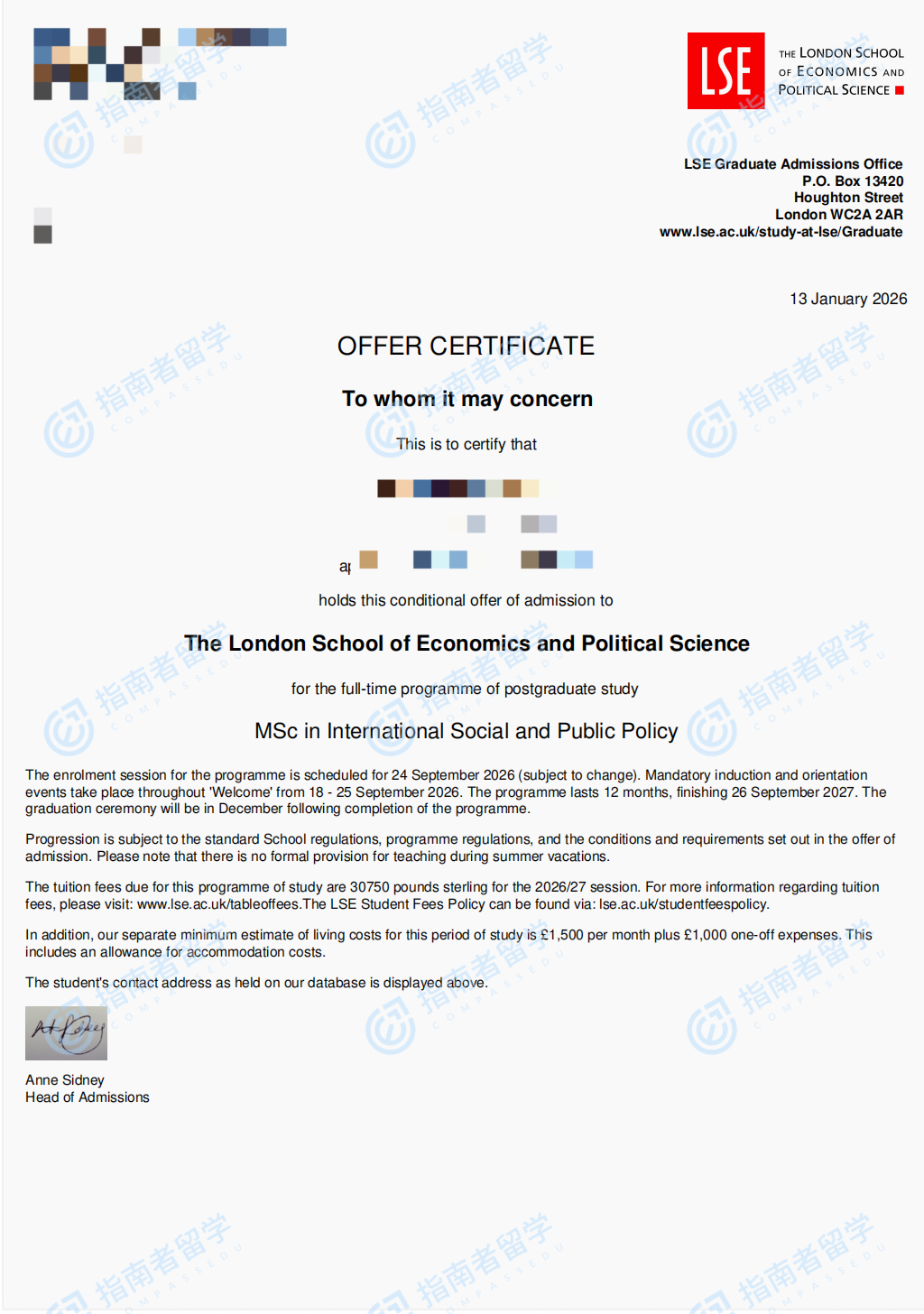 伦敦政治经济学院国际社会与公共政策理学硕士研究生offer一枚