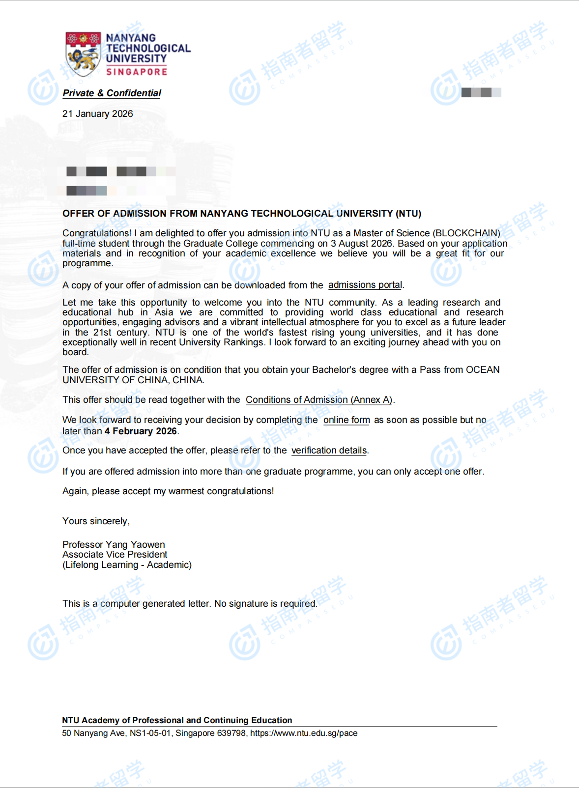 南洋理工大学区块链理学硕士研究生offer一枚