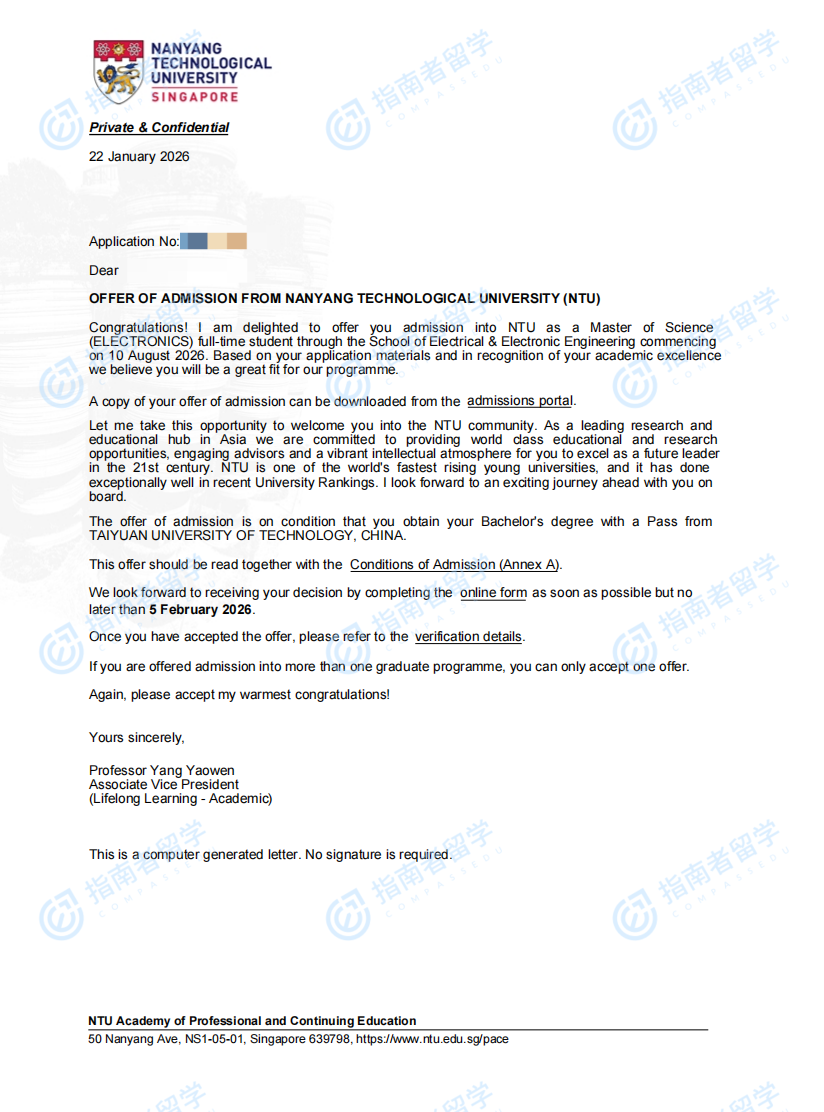 南洋理工大学电子学理学硕士研究生offer一枚