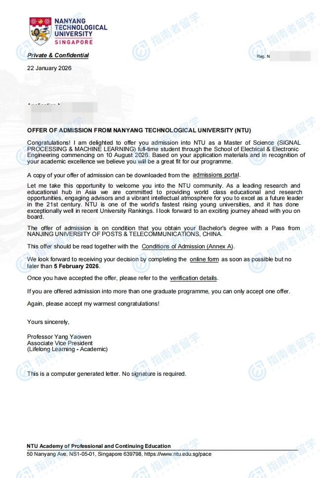 南洋理工大学信号处理和机器学习理学硕士研究生offer一枚