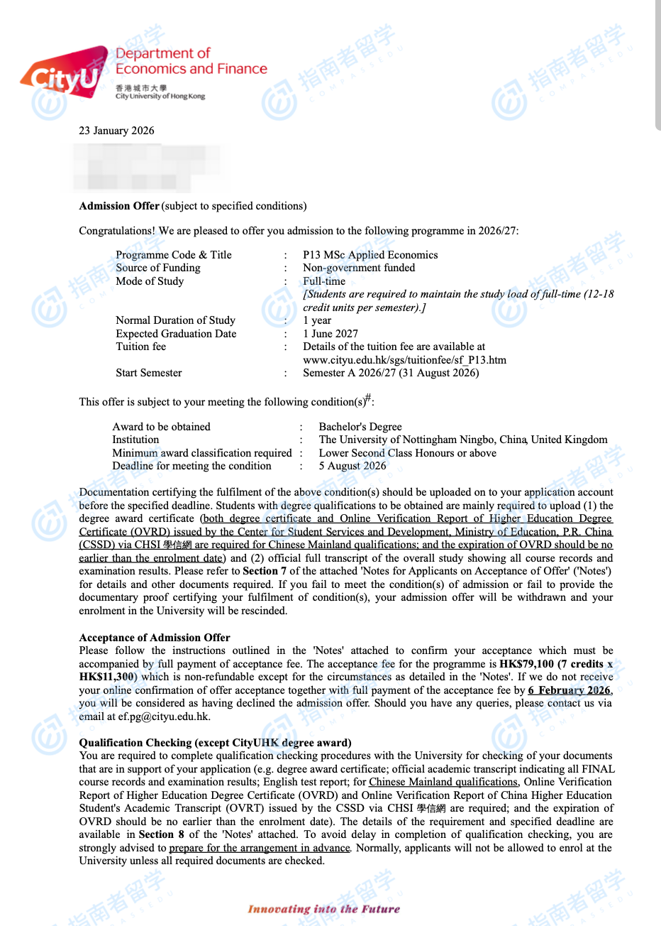 香港城市大学应用经济学理学硕士研究生offer一枚