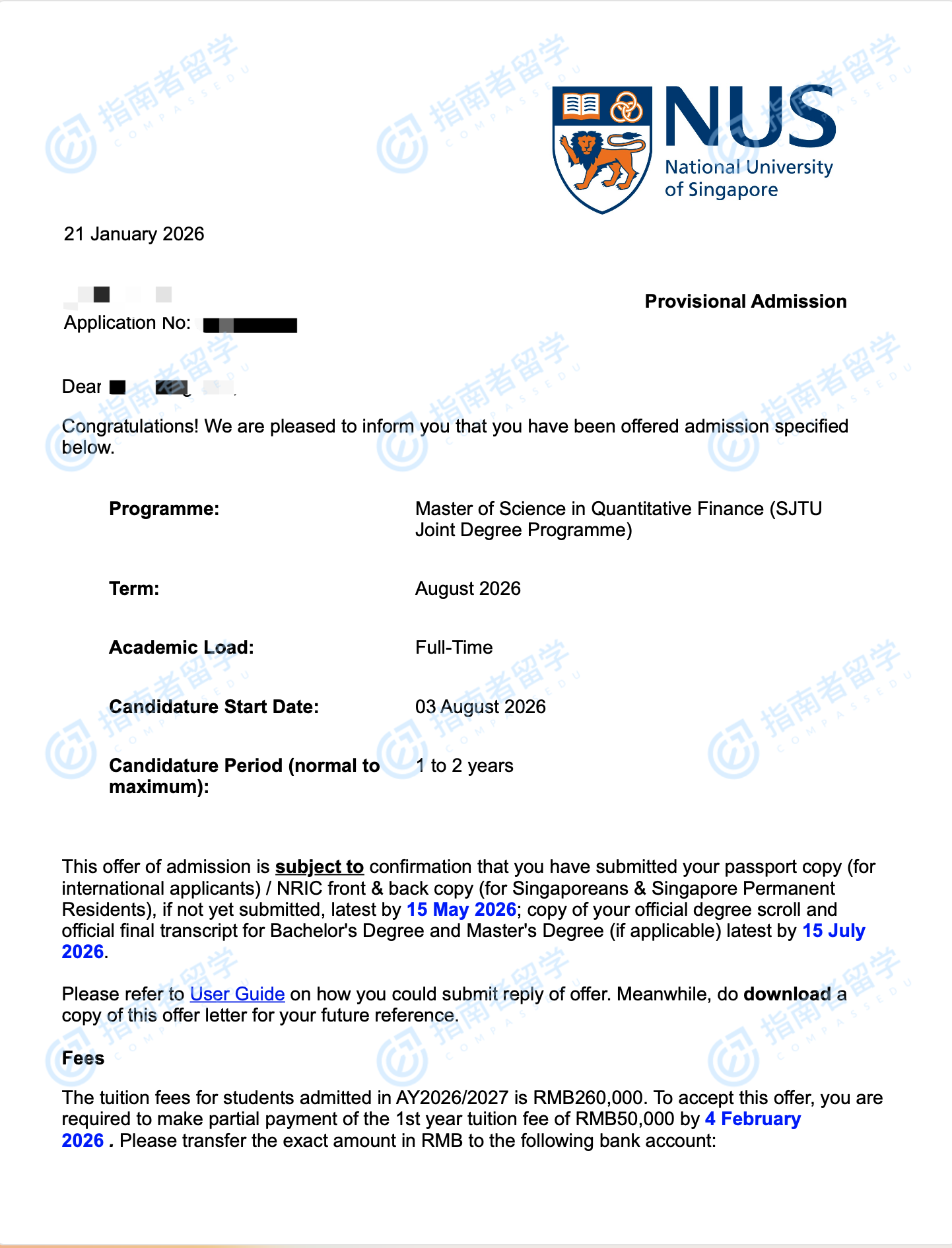 新加坡国立大学定量金融理学硕士(新加坡国立大学-上海交通大学联合开设)研究生offer一枚