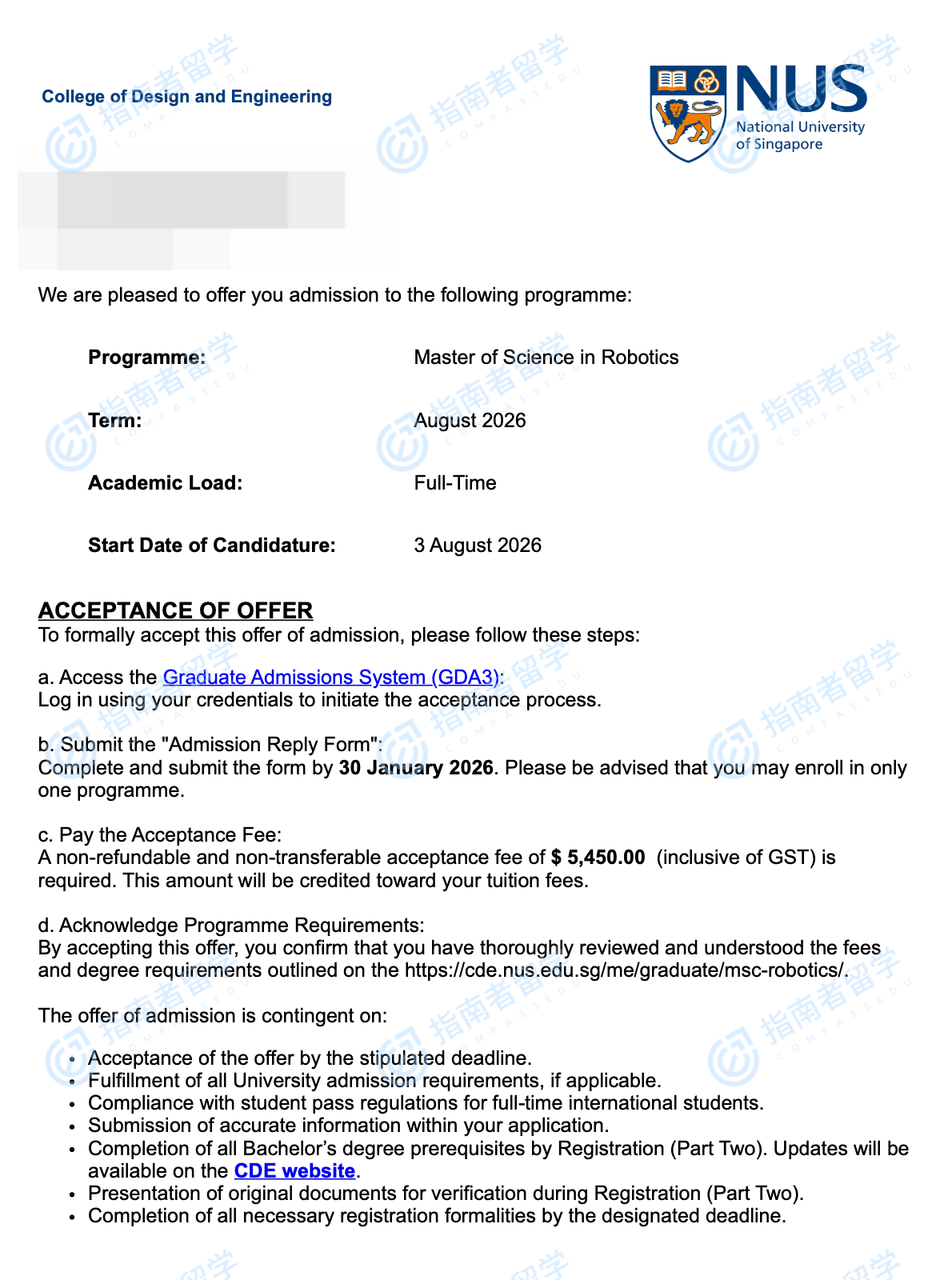 新加坡国立大学机器人学理学硕士研究生offer一枚
