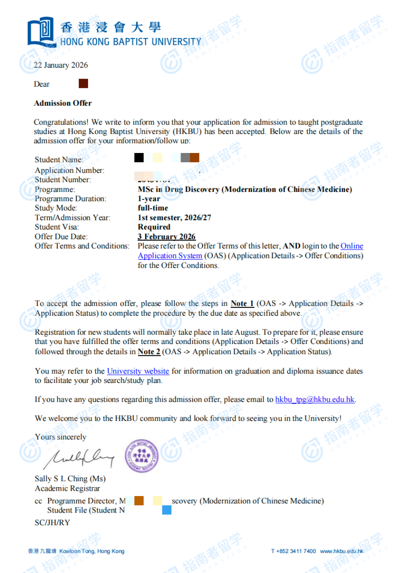 香港浸会大学药物发现(中药现代化)理学硕士研究生offer一枚