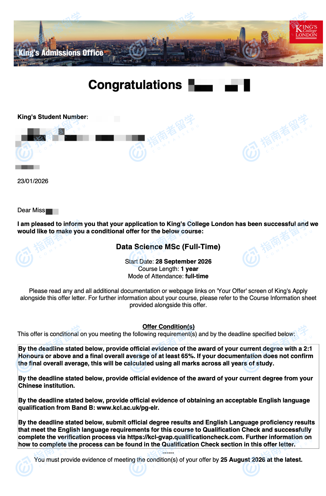 伦敦大学国王学院数据科学理学硕士研究生offer一枚