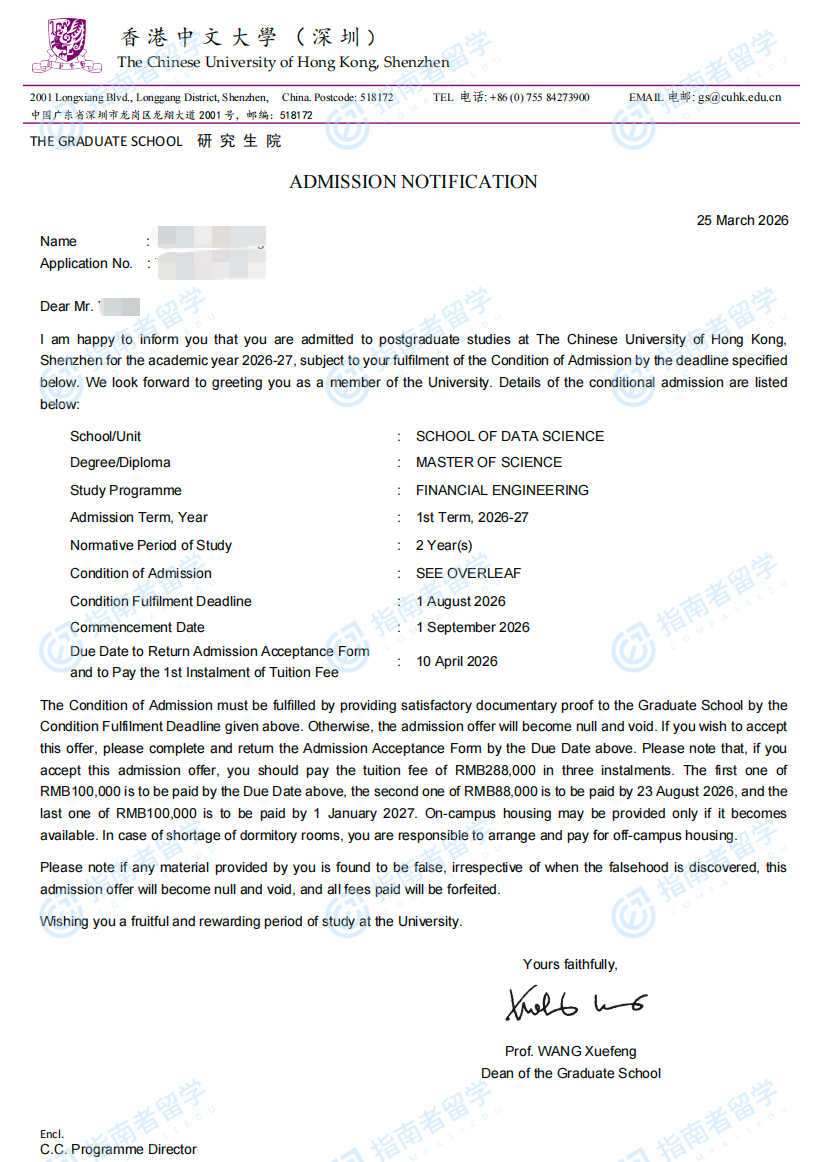 香港中文大学金融工程理学硕士(CUHK-Shenzhen)研究生offer一枚
