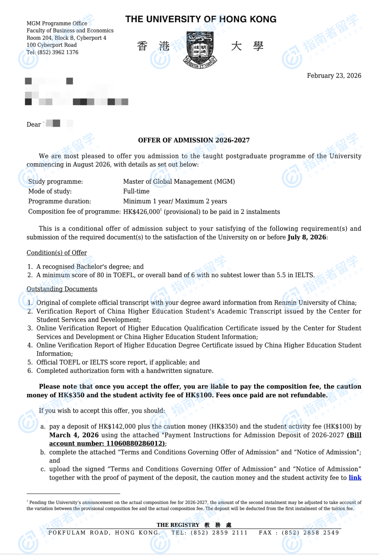 香港大学环球管理学硕士研究生offer一枚