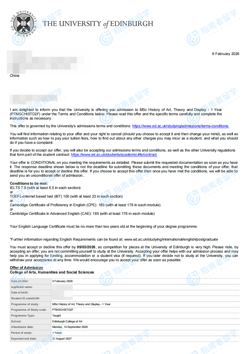 爱丁堡大学艺术史、理论与展览理学硕士研究生offer一枚