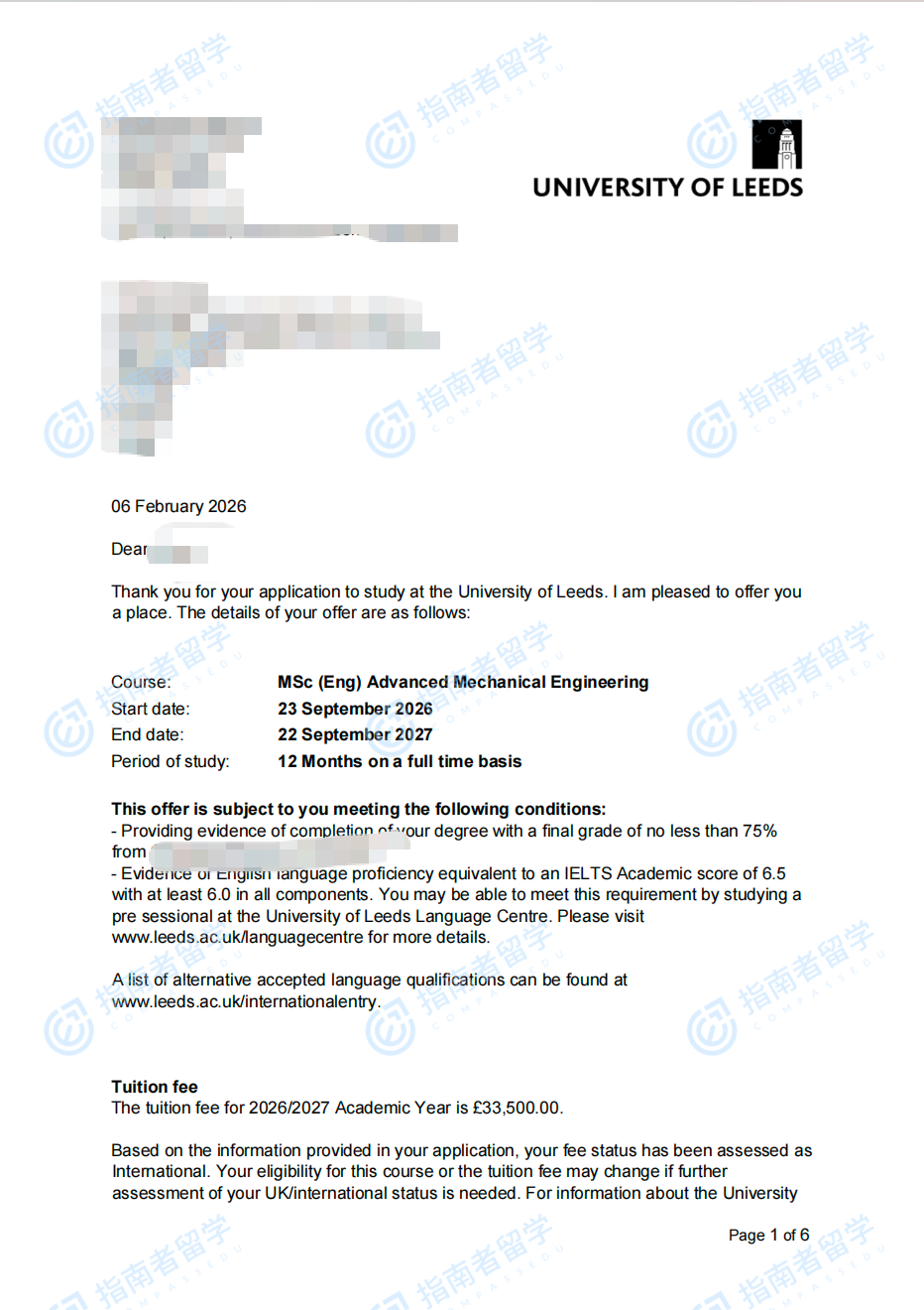 利兹大学高级机械工程(工程)理学硕士研究生offer一枚
