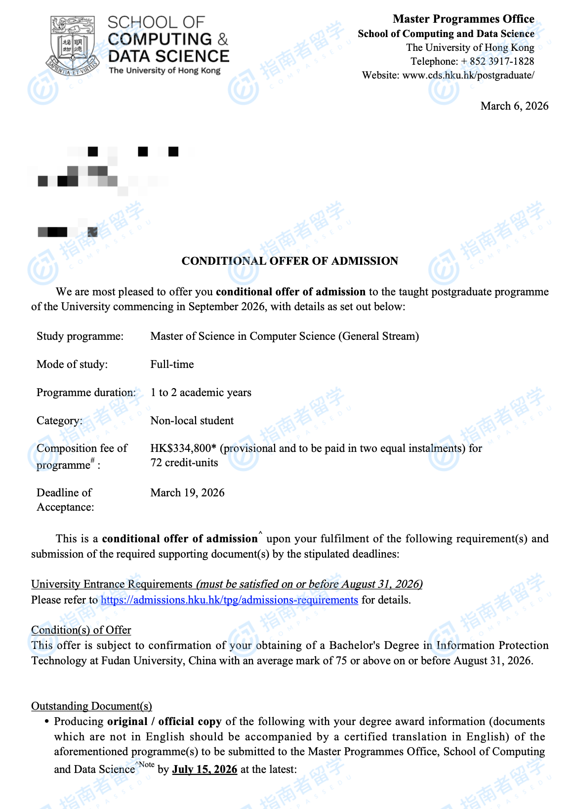 香港大学计算机科学理学硕士(常规方向)研究生offer一枚