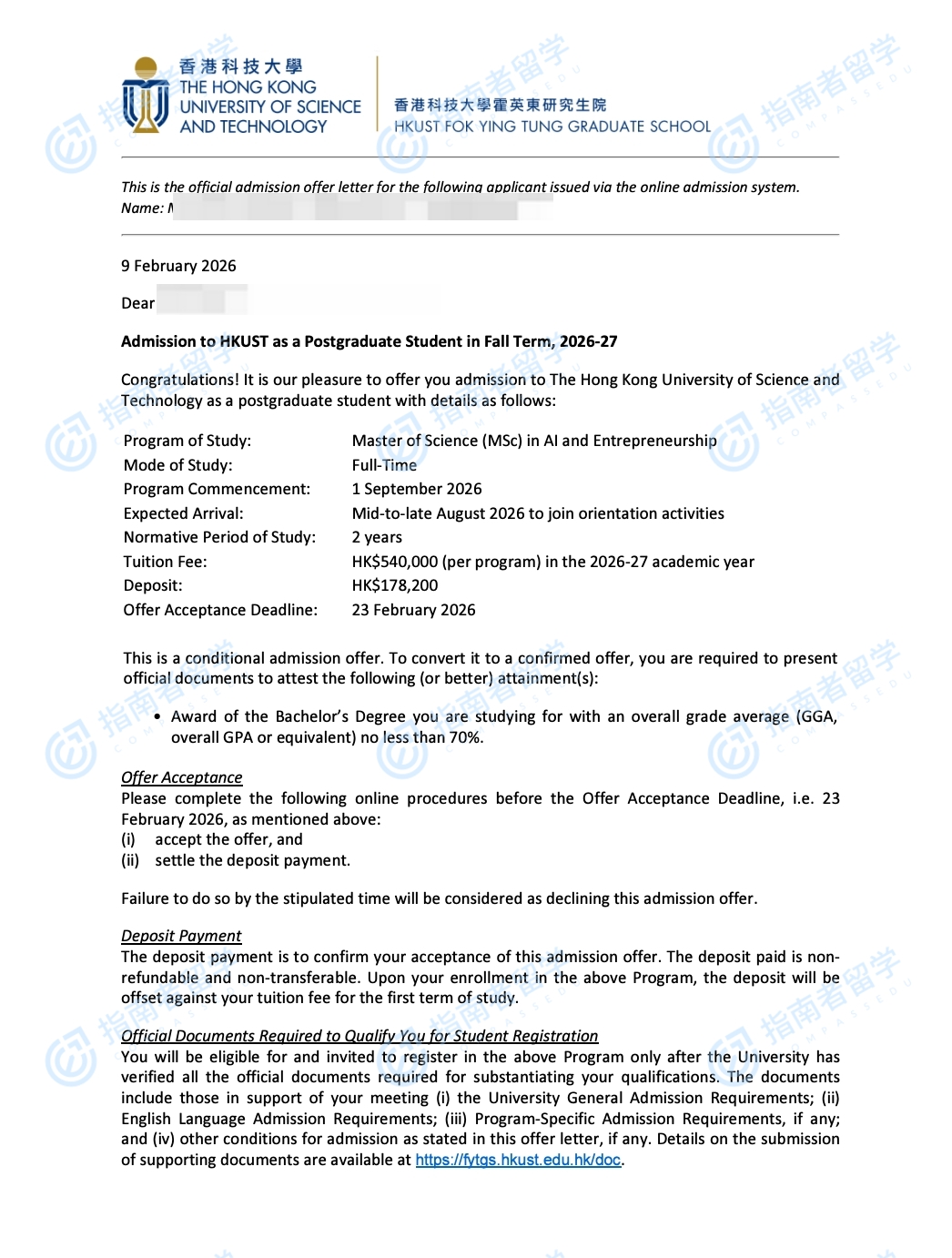 香港科技大学人工智能与创业理学硕士研究生offer一枚