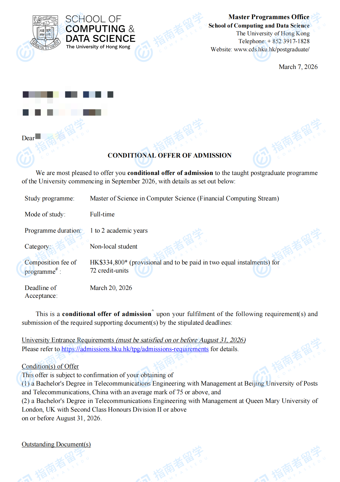 香港大学计算机科学理学硕士(金融计算方向)研究生offer一枚