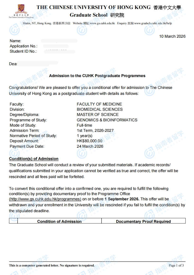 香港中文大学基因组学与生物信息理学硕士研究生offer一枚